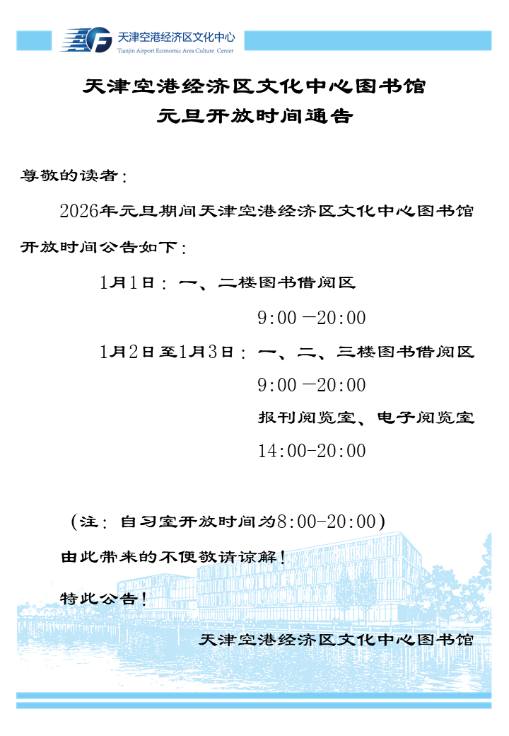【重要通知】天津空港经济区文化中心图书馆元旦开放时间通告